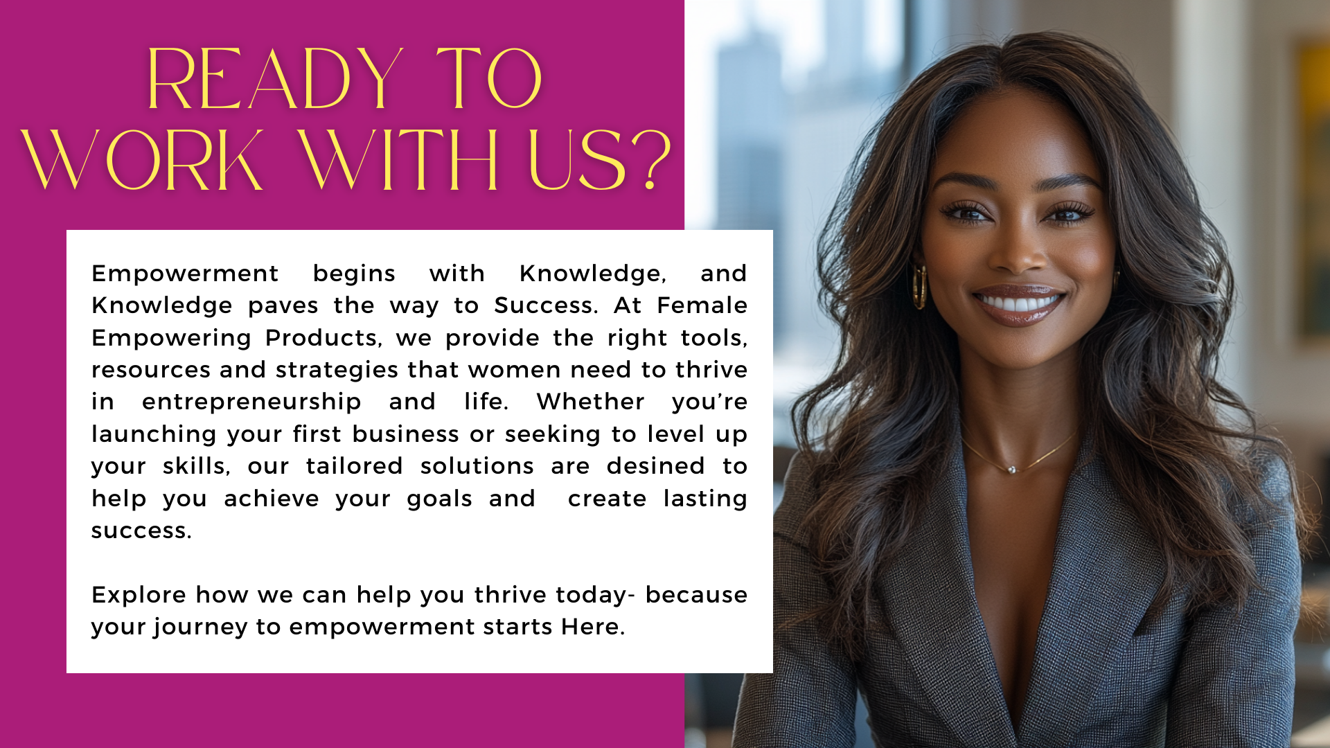 Welcome to Female Empowering Products,where our mission is to uplift and empower women in every aspect of their lives. We understand the unique challenges women face in balancing business,personal growth and wellbeing, and we're here to help you overcome those obstacles. Whether you're struggling to launch a business, find direction in your personal development or maintain holistic health, our comprehensive services are designed to guide you toward success. From entrepreneurship coaching to wellness strategies, we provide actionable solutions that help you take control of your future and unlock your full potential.
